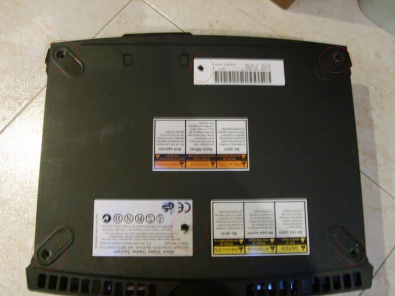 Irrota myös kaksi ruuvia, jotka ovat tarrojen sivuilla. Käännä sitten ympärillesi konsoli varovasti ja poista yläkansi. Näet Xboxin komponentit.