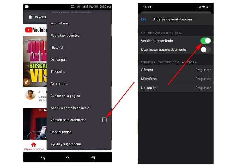 Selaimen kautta meidän on mentävä kirjautumaan YouTubeen. Androidissa painamme 3 pisteen painiketta, jolloin saat näkyviin lisäasetusten valikon ja valitsemme ”Versio tietokoneelle”. Napsauta iPhonessa AA-painiketta ja siirry ”Verkkosivusto työpöytäversiossa”.
